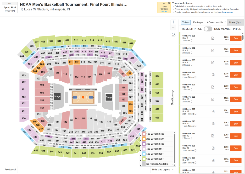 For those seeking more premium acommodations – a real concern given the modern Men’s Final Four having been moved into NFL stadiums like Lucas Oil means some upper level locations are very far from courtside – prices are far sharper. Tickets in the 100-level start at a startling $2,139 and up for all-sessions passes as of Monday afternoon, with semifinal-session 100-level seats starting at $1,151 for members.