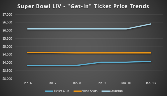 Ticket Club’s cheapest Super Bowl LIV tickets as of January 13 comes in at $4,086. Just days before, it boasted an even lower get-in price of $3,845. That figure falls considerably below the lowest offerings on both StubHub and Vivid Seats. The former ran steady with a get-in cost of roughly $6,100 last week, before jumping to $6,410 following divisional round action. The latter has stayed consistent at a $4,635 minimum cost.
