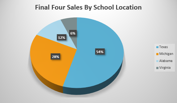While it may be too late to get tickets for those requiring lengthy travel, there will be plenty of fans from across the country at the tournament’s exciting conclusion. Our geographic consumer data found that this year’s Final Four ticket-buyers hail from 37 states, including those represented by this year’s Final Four teams. Of the schools left standing, No. 3 Texas Tech might have the most support in the stands. Texas-based buyers made up 54 percent of the sales made by each school’s state. Michigan State earned 28 percent of that pie, a seemingly low percentage given its close proximity to Minneapolis. Alabama locals are hoping to see No. 5 Auburn take home the title, and they accounted for 12 percent of sales. Despite Virginia being the lone No. 1 team left standing, fans aren’t convinced this is their year. Virginia buyers took up only 6 percent of Final Four sales.