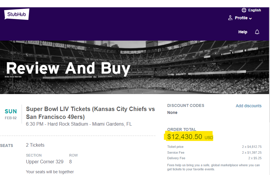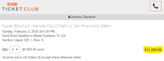 Two tickets in the eighth row of upper endzone section 329 carry differing costs depending on the site. StubHub buyers will think they’ve found the best deal at first glance with each ticket costing $4,812. Vivid Seats lists the ticket price as $4,832 while Ticket Club is listed at $5,600. However, when factoring in service and delivery fees, Ticket Club’s fee-free total comes in over $1,000 less than the others. Even if you aren’t a current Ticket Club member, the one-time $50 cost to sign up will be saved many times over on just the purchase of Super Bowl tickets.